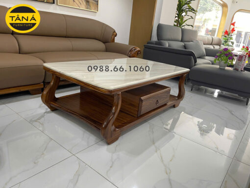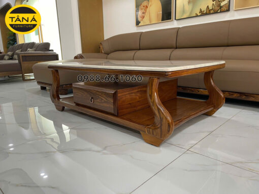 Thiết kế bàn gồm kệ để đồ rộng bên dưới và một hộc kéo tiện dụng ở giữa, cho phép cất giữ từ remote, sách báo đến các vật dụng nhỏ, giúp phòng khách luôn gọn gàng. Đường cong hai bên và phần chân được bo mềm mại tạo cảm giác thanh thoát nhưng vẫn chắc chắn, mang đậm phong cách nội thất cao cấp.